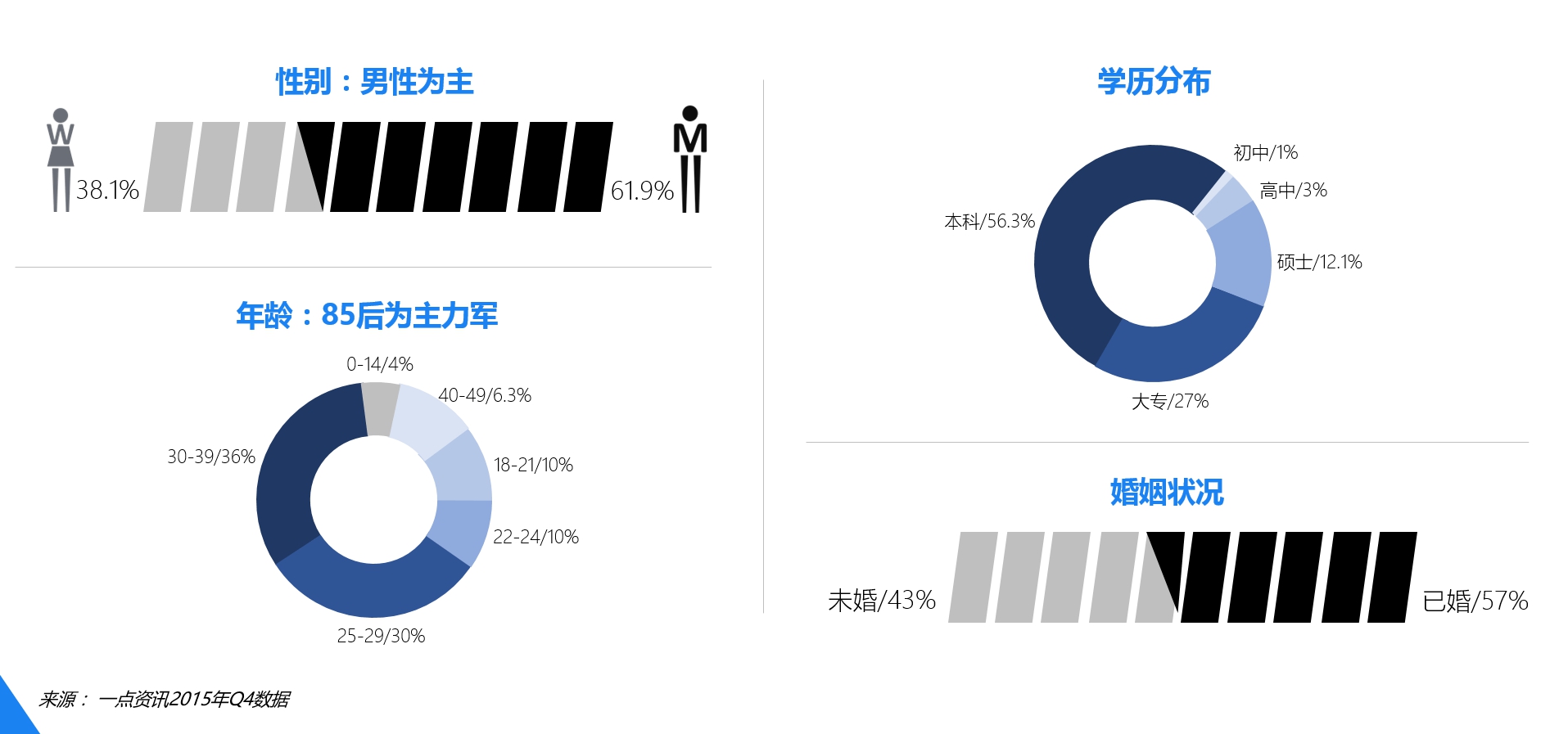 (3)年輕高端。一點資訊的用戶大部分集中在21-40歲之間,90后用戶群占據主導,擁有潛在主流消費群體,白領、高學歷、高收入人群居多。