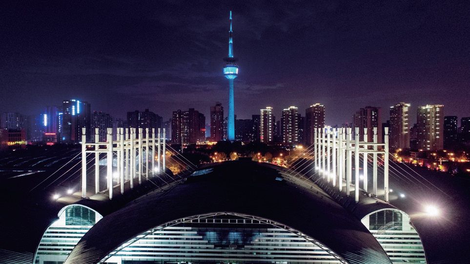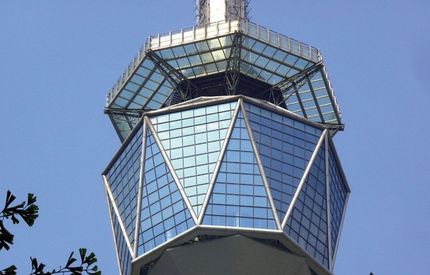 電視塔高245米,建筑面積6000㎡,外形似通天寶塔,16棱形的塔座和塔樓用寶藍色玻璃幕墻裝飾,像一顆耀眼的藍寶石橫穿寶塔。