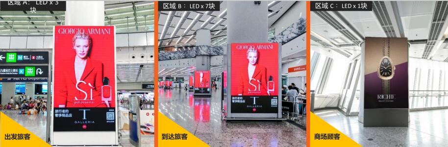 100%吸引出發(fā)旅客注目;所有到達(dá)旅客的必經(jīng)之路;安檢區(qū)入口的必經(jīng)之路;向圓方電梯來往的到達(dá)旅客;一系列的LED屏能為廣告達(dá)到最大的曝光效果;廣告可發(fā)揮多重創(chuàng)意
