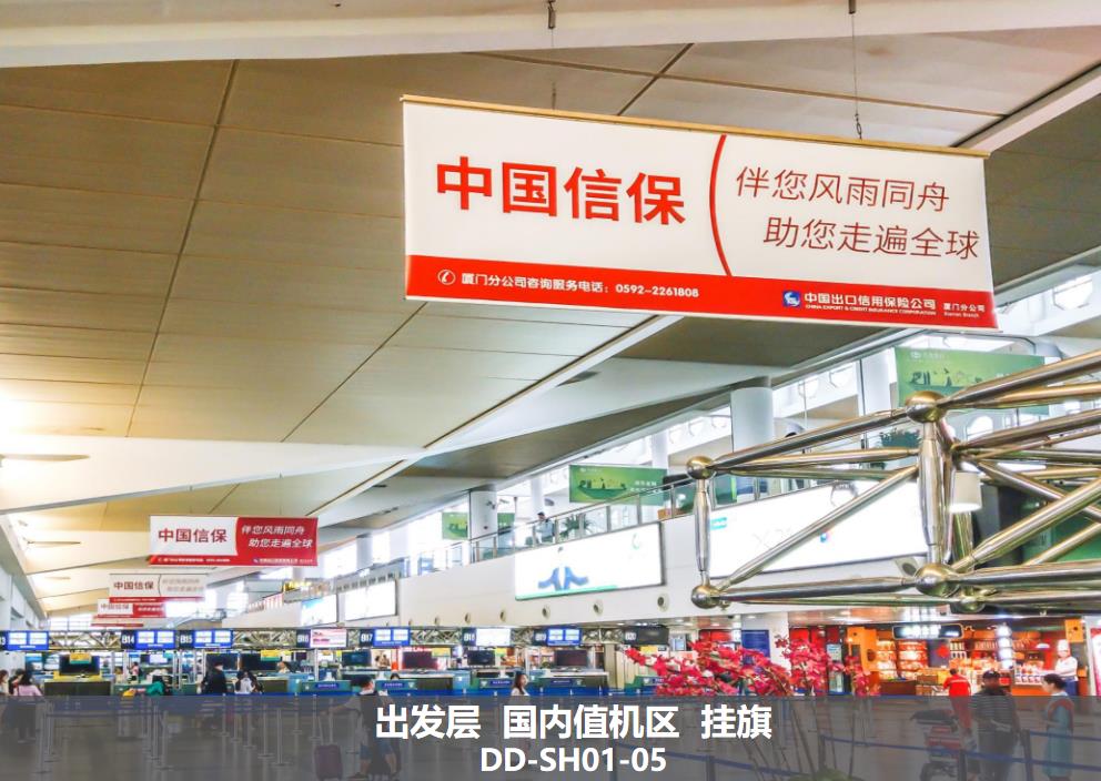 媒體位于航站樓國內出發廳值機島上方; 媒體為雙面吊旗媒體;