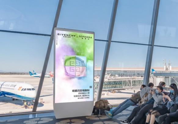 機場電視、刷屏機廣告是機場中數字化戶外媒體的常見廣告形式,一般形態是落地立式刷屏機、懸掛電視,廣泛分布在機場、地鐵站、樓宇電梯等候區等公共場所,采用終端聯網控制的特性讓廣告可實現實時播放控制。在人流量密集的場所刷屏機擁有的聲音+視頻動態傳播的效果可使廣告具備更高的吸引力。
