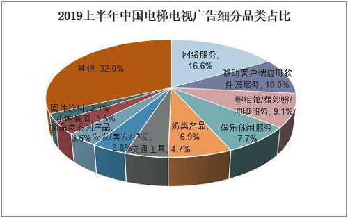 從電梯電視廣告來看,2019年上半年中國電梯電視廣告細分品類占比最大的為網絡服務,占比達16.6%,其次為移動客戶端應用軟件及服務,占比10%,照相館/婚紗照/沖印服務占比為9.1%,排名第三,娛樂休閑服務和奶粉產品分別占比7.7%、6.9%,排名第四、五位。