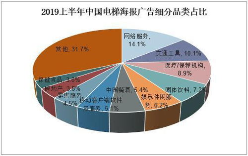 從電梯海報廣告細分品類占比情況來看,其中2019年上半年中國電梯海報廣告細分品類中占比最大的仍為網絡服務,與電梯電視廣告相同,而第二、三名則分別為交通工具、醫(yī)療/保薦機構,占比10.1%、8.9%,移動客戶端應用軟件及服務占比5.1%,排到第七位。