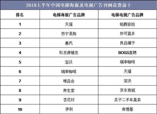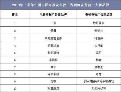 隨著傳統(tǒng)品牌廣告主對電梯廣告媒體的認可度逐漸提升,電梯電視/電梯海報新品牌數量大幅增長,2019年上半年中國電梯海報廣告刊例花費前五大新品牌分別為三金、景田、東方財富證券、鉑爵旅拍和長安福特,電梯電視廣告刊例花費前五大新品牌分別為妙可藍多、卡姿蘭、科發(fā)源、大搜車和添可。