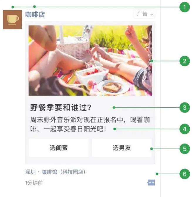 2. 外層文案;3. 外層圖片;4.文字鏈;5.門店標識(有線下門店可選擇展示);6.用戶社交互動。
